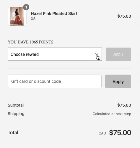 At checkout, you can easily redeem your points in one simple click. The points will be converted into a Rewards Coupons automatically.
